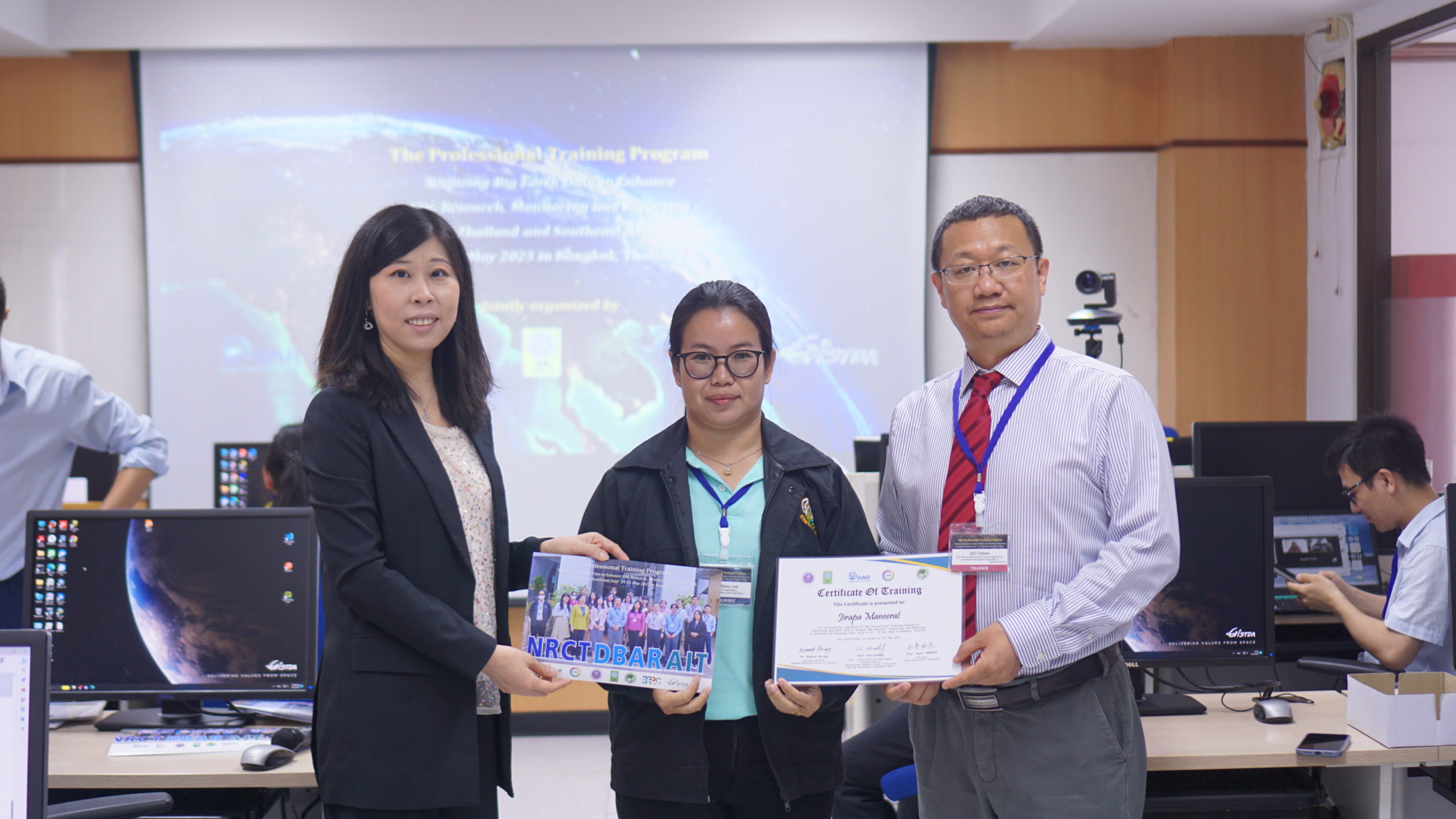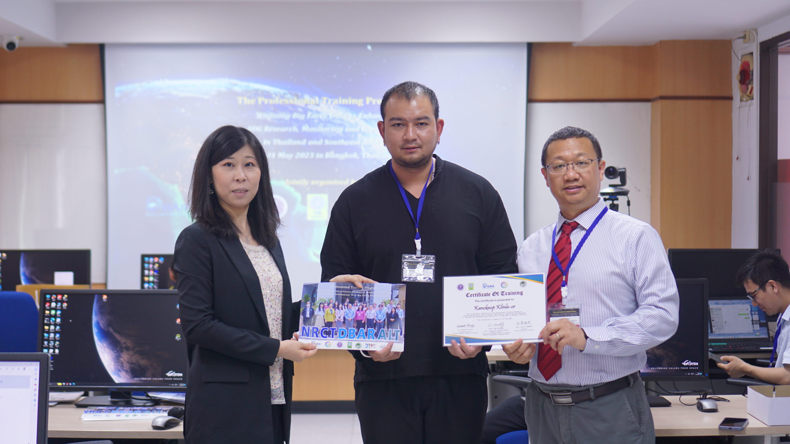 Dr. Monthip also mentioned that research, monitoring and reporting are essential elements for SDG achievements, especially on assessing climate change impact and the status of water security. To be able to assess, we need to measure, and utilizing big earth data help decision-makes make an objective evaluation of the situation. And always remember that what you have learned from this training course should be utilized for the betterment of society. Hope the knowledge gained in this training workshop will benefit not only the individual participants but also the organizations they represent. We are honored and appreciated that you could be here with us.