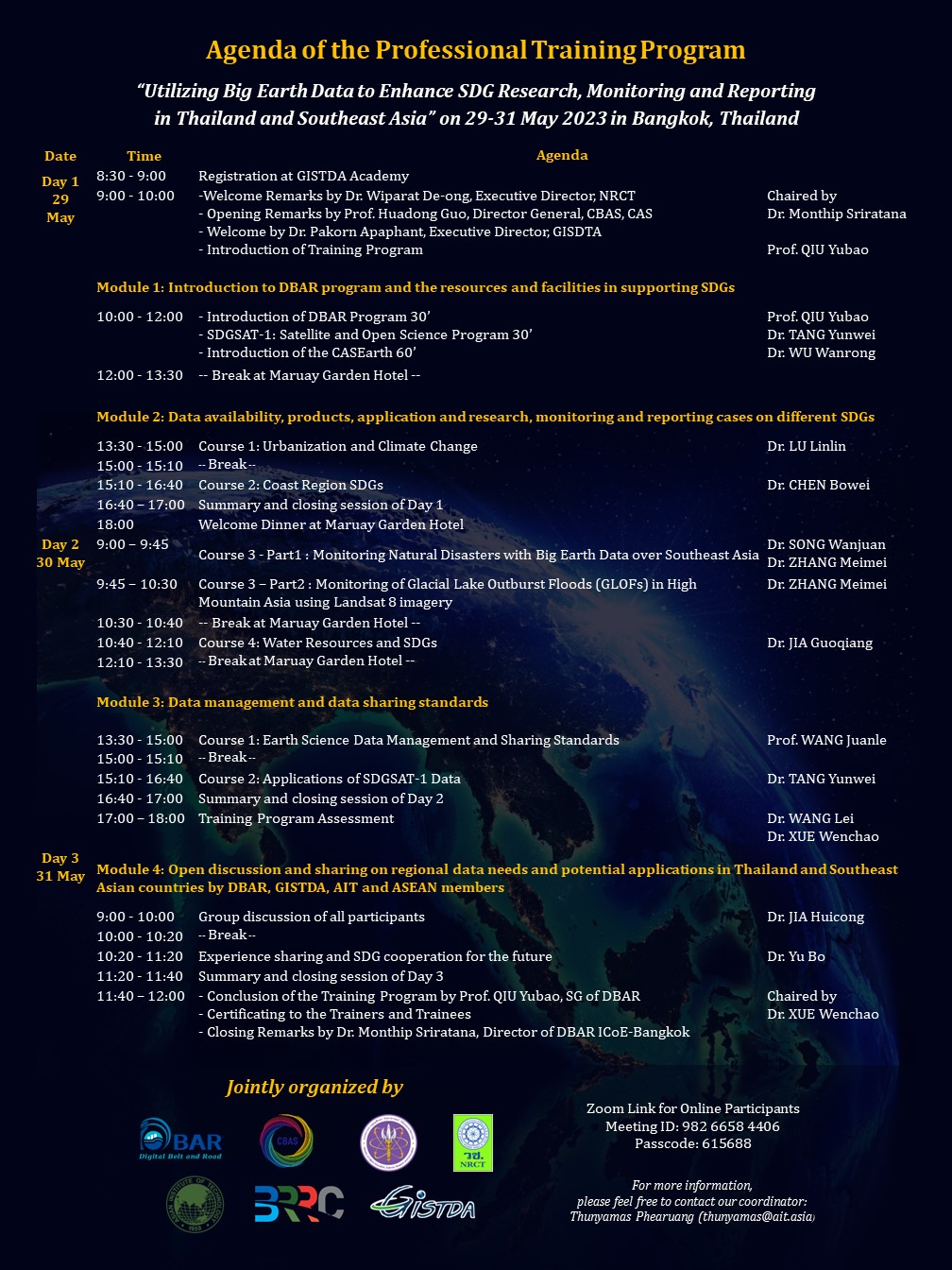 The training program is jointly organized by NRCT, Digital Belt and Road (DBAR), DBAR International Center of Excellence (ICoE-Bangkok), International Research Center of Big Data for Sustainable Development Goals (CBAS), and the Belt and Road Research Center of the Asian Institute of Technology (AIT-BRRC), aims to introduce the principles and cases of utilizing Big Earth Data in SDGs monitoring and progress reporting and to promote the data resources and facilities of DBAR in terms of implementation. It will build on the capacity and network of knowledge professionals, practitioners, and managers applying Big Earth data for SDG study and reporting in Thailand and the ASEAN region.
